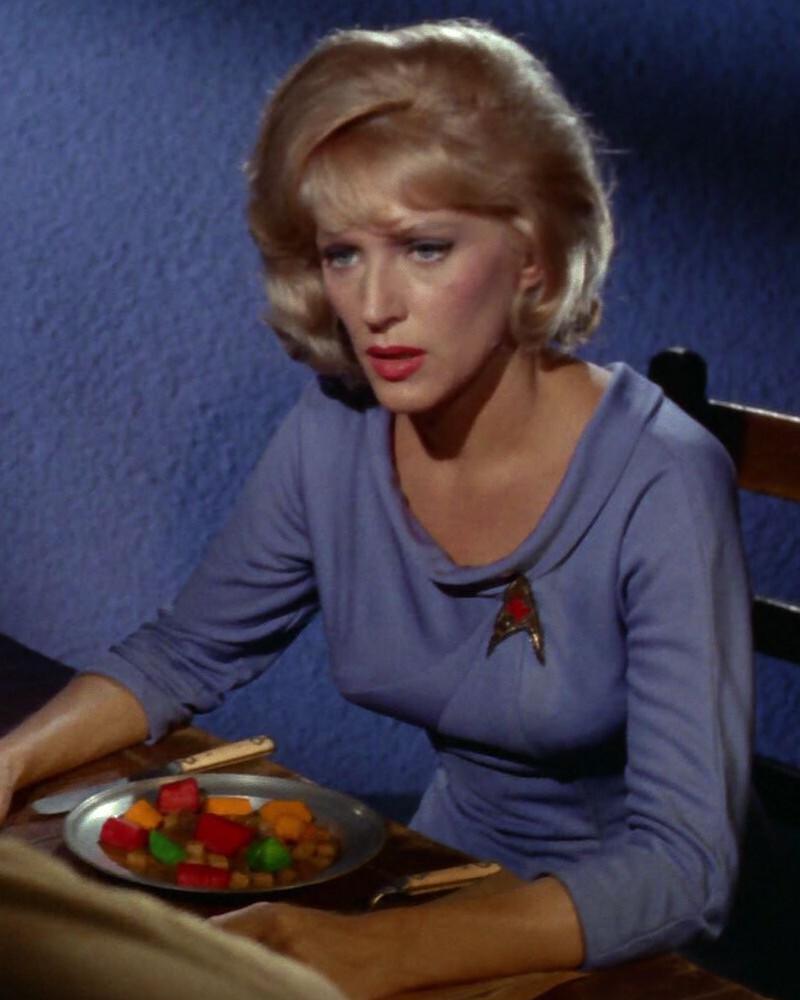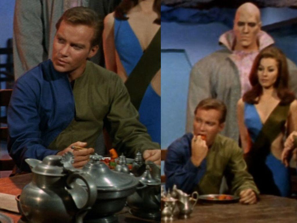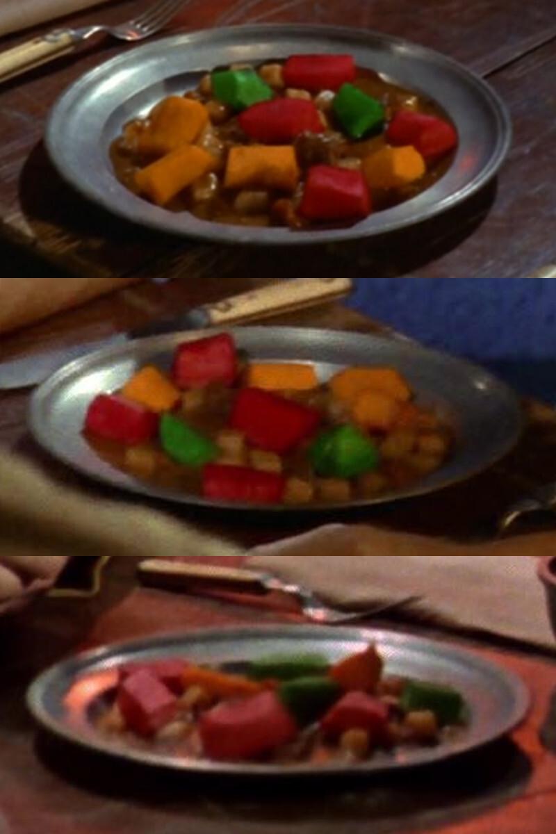 In #StarTrekTOS' "What Are Little Girls Made Of?", colourful food cube stew has its biggest appearance. Three plates of the food (only red, green and orange cubes plus brown smaller meat cubes) are seen and Kirk is seen eating one of the orange cubes. Android Kirk and Chapel don't touch the food.
